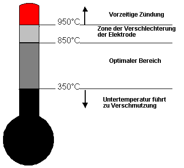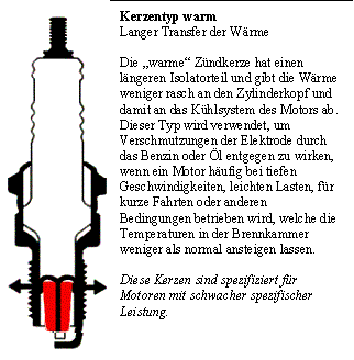 Die Wahl der ZündkerzeEine genau eingestellte Zündung und eine komplette Verbrennung in jedem Zylinder sind die wichtigsten Faktoren, um einen Motor optimal und wirtschaftlich funktionieren zu lassen. Der Funke zwischen den Elektroden einer Kerze muss bei jeder Drehzahl von guter Qualität sein, um für eine gute Zündung des Benzin-Luft-Gemisches zu sorgen. Es ist wichtig, dass die Zündkerzen zum Motor passen und dem benötigten thermischen Bereich entsprechen. Prinzip der WärmeabgabeUm die optimale Leistung zu erbringen, darf die Temperatur der Isolatorenspitze 850°C bei längerer erhöhter Geschwindigkeit nicht überschreiten oder 350°C nicht unterschreiten, wenn bei 50 km/h im Stadtverkehr gefahren wird. Die Zündkerzen werden klassifiziert nach ihrer Charakteristik der Wärmeabgabe von der vordersten Spitze des Isolators zum Kühlsystem des Motors. |